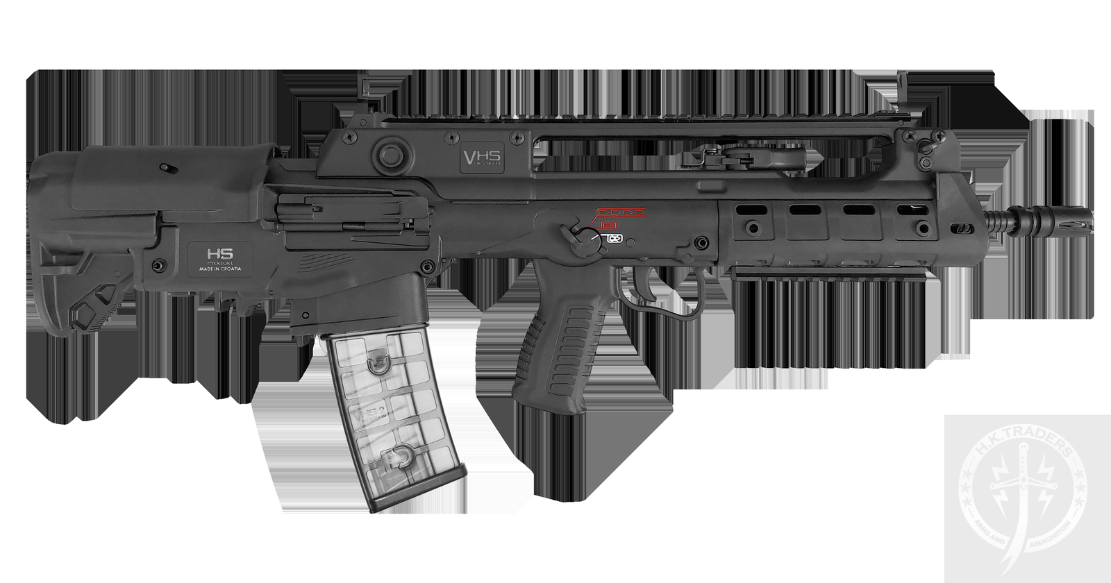 VHS-2 is a fully ambidextrous 5.56 NATO caliber assault rifle. Designed on bullpup modular platform it maintain all the ballistic benefits of a longer barrel in a shorter package without sacrificing overall length, accuracy and muzzle velocity. The polymer receiver is equipped with an 5 point adjustable buttstock. Combination of all of this with dual dust cover ejection ports on both sides of the receiver and specially designed empy case deflectors create flexible and user friendly multi-purpose rifle. The rifle is equipped either with an carrying handle with NATO STANAG 4694 rail and flip up iron sights or with integrated 1.5X optical red dot sight. Front handguard has NATO STANAG 4694 rails at the 3, 6, and 9 o’clock positions with removable rail covers so the rifle can accept extra accesories. Magazines are made of durable polymer with semi transparent pattern and 30 rounds capacity allowing the operator to quickly view the ammunition count without removing the magazine. VHS-2 uses proved short-stroke gas piston operating system with rotating bolt. The rifle can fit VHS-BG 40 mm single shot grenade launcher under the barrel. VHS-2 is coming in two different versions: VHS-2D 500 mm barrel lenght designated marksman version with effective range up to 800 m and VHS-2K 410 mm barrel lenght standard base version.
